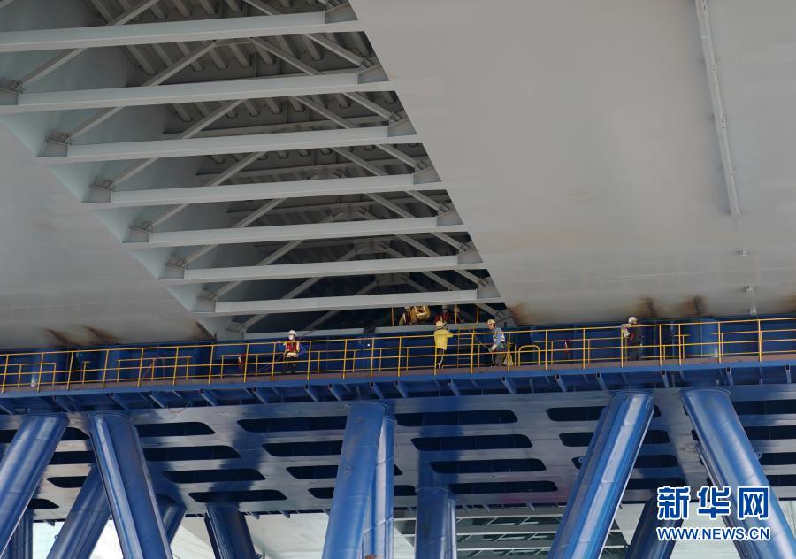 大橋由多個(gè)大型鋼鐵及混凝土構(gòu)件組成,這些組件均在內(nèi)地工廠生產(chǎn),分別來(lái)自江蘇南通、廣東新會(huì)和番禺,組件中最大的“家伙”就是眼前這個(gè)萬(wàn)噸雙拱鋼橋。