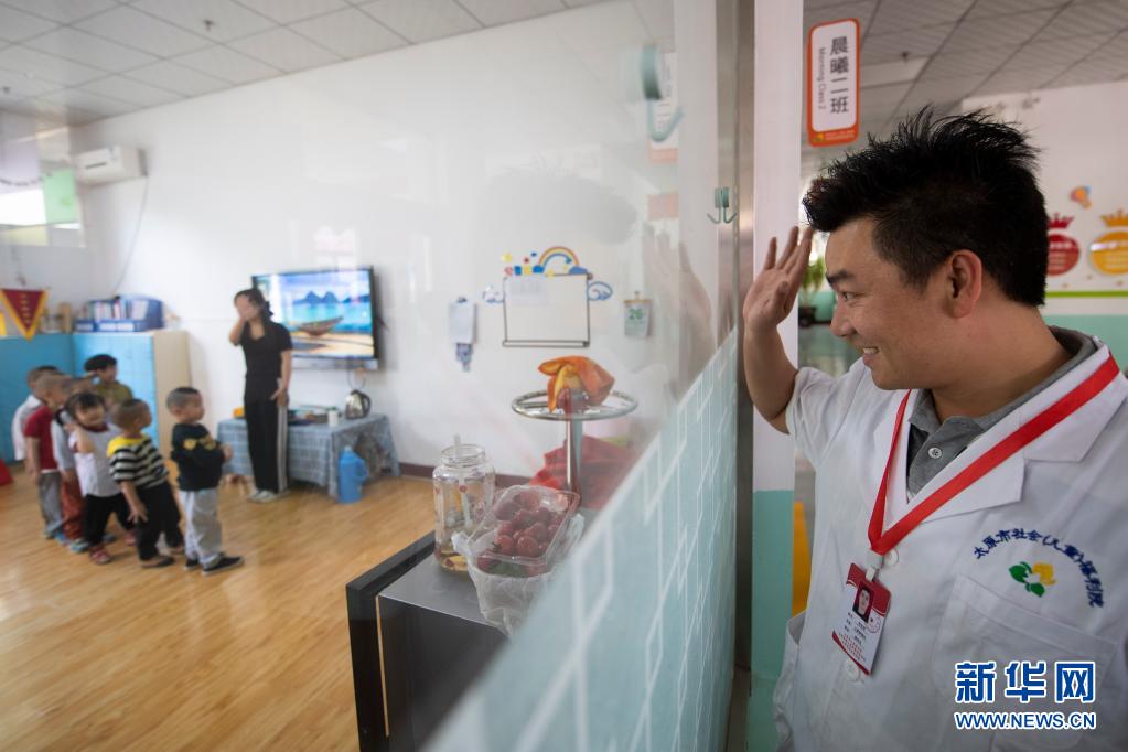 在太原市社會(huì)(兒童)福利院內(nèi)的特教學(xué)校,黨龍祥看著正在為六一準(zhǔn)備節(jié)目的孩子們(5月26日攝)。新華社記者 楊晨光 攝