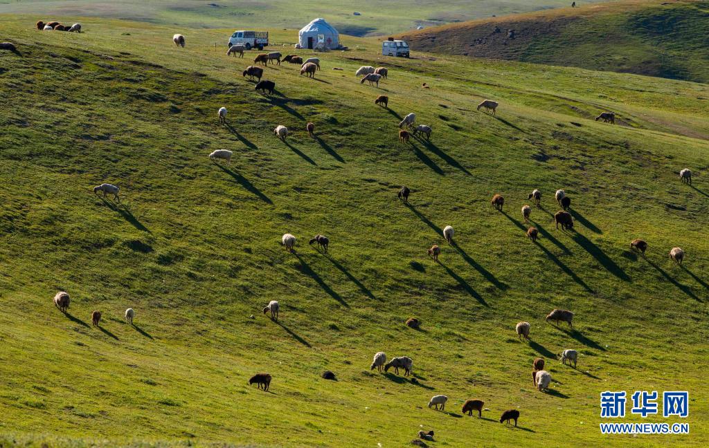 新疆裕民縣巴爾魯克山區(qū)夏牧場(chǎng)上的羊群、氈房、汽車(6月14日攝)。