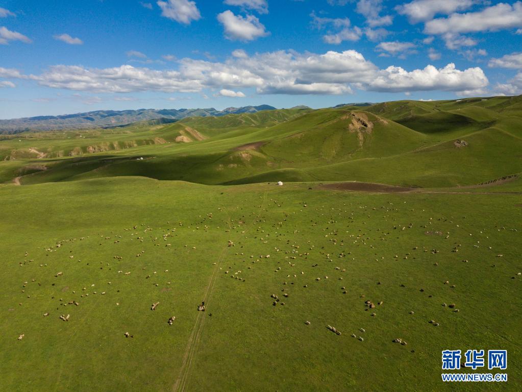 新疆裕民縣巴爾魯克山區(qū)夏牧場(chǎng)上的牛羊、氈房(6月15日攝,無(wú)人機(jī)照片)。