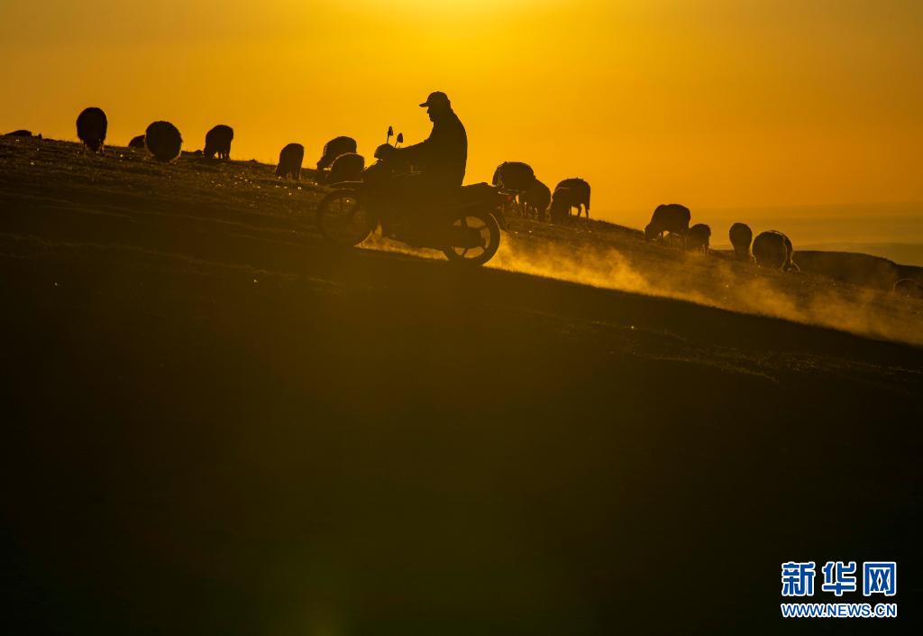 牧歸時分,在新疆裕民縣巴爾魯克山區(qū)夏牧場上,一名牧民騎著摩托車“收攏”羊群(6月15日攝)。