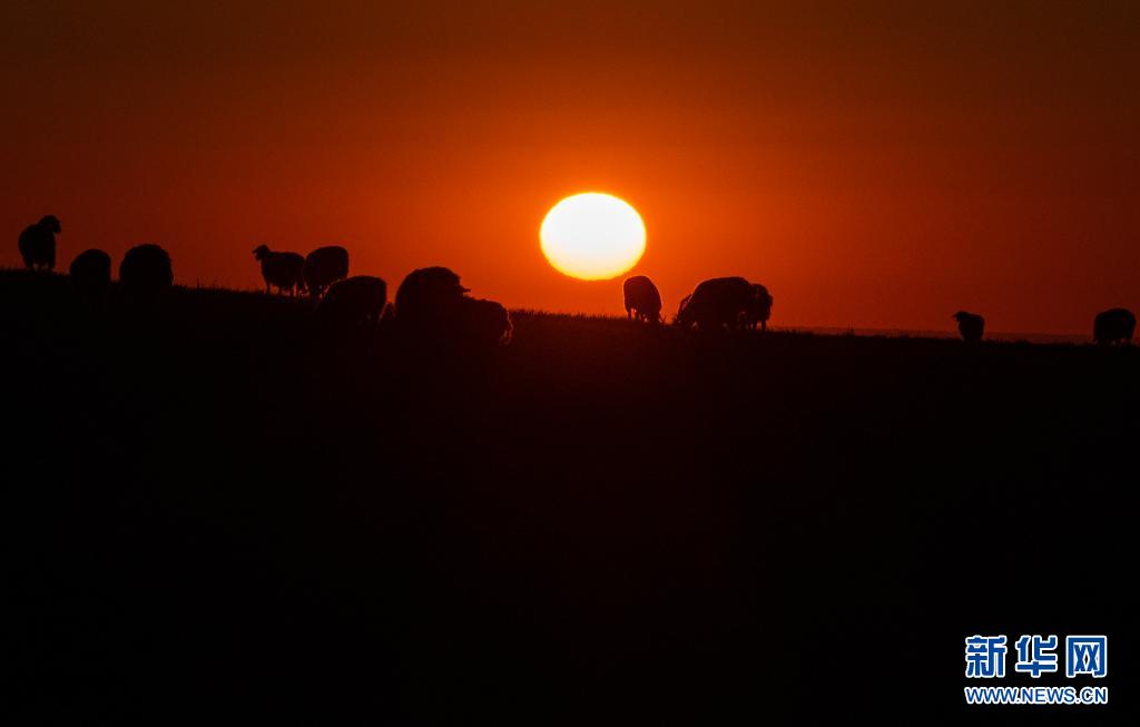 落日映紅新疆裕民縣巴爾魯克山區(qū)夏牧場的天空,羊群仍流連于牧草,緩緩而歸(6月15日攝)。
