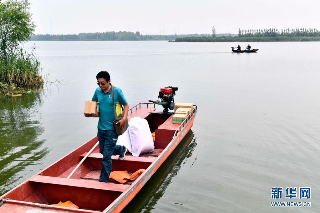 6月20日,在微山縣南陽(yáng)鎮(zhèn)丁樓村,郵遞員王少朋將郵船停穩(wěn)后,帶上郵件為村民投遞。