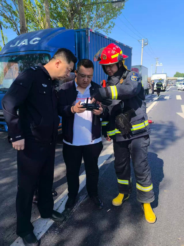 “大家快后退,危险!别围观!”“消防车很快就到,千万别靠近!”面对烈火浓烟,三人沉着分工、默契配合。刘健一边大声劝导群众,一边迅速启动警用无人机升空,全方位排查是否有人员被困、隐蔽火源,实时回传火场画面。卜宪刚和王雷迅速划定警戒区,引导车辆分流避让,重点指挥危险品运输车辆绕行,杜绝二次事故。