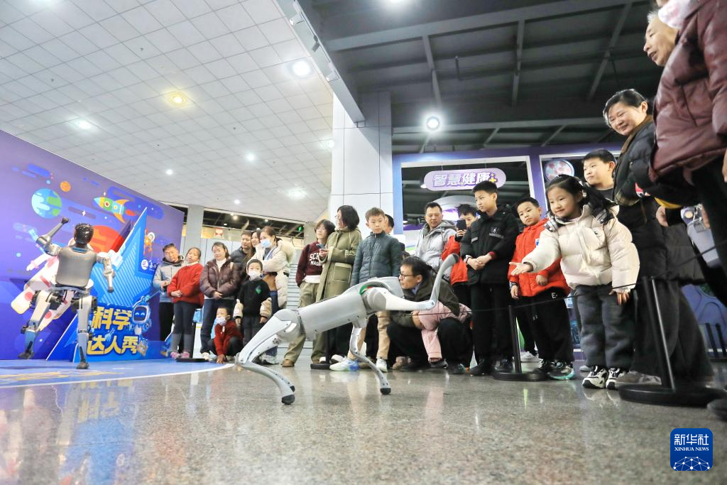 1月2日,在浙江省嘉兴市科技馆,小朋友在“新质生产力·未来新引擎”科普主题展上与人形机器人和机器狗互动。