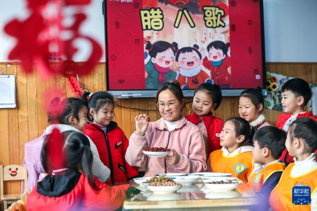 1月26日,在山东省临沂市沂南县湖头镇中心幼儿园,老师教小朋友认识制作腊八粥的食材。