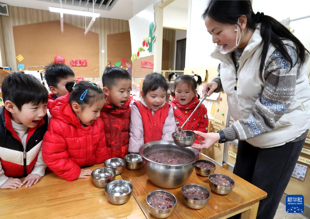 1月26日,在江苏苏州工业园区东兴路幼儿园,老师为小朋友盛腊八粥。