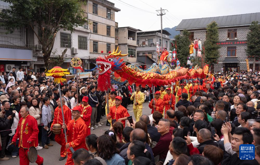3月21日,在四川省兴文县大坝苗族乡晏州社区,龙灯队开启大坝高装非遗巡游。