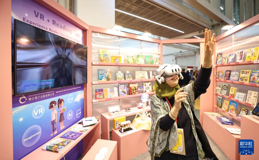 4月14日,在意大利博洛尼亚,观众在第63届博洛尼亚国际儿童书展上体验虚拟现实阅读设备。