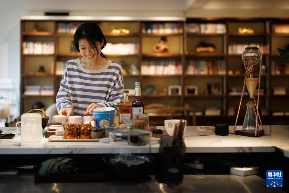 4月20日,村民付王梅(右)在肇兴侗寨鼓亭全景咖啡馆里为顾客制作茶饮。