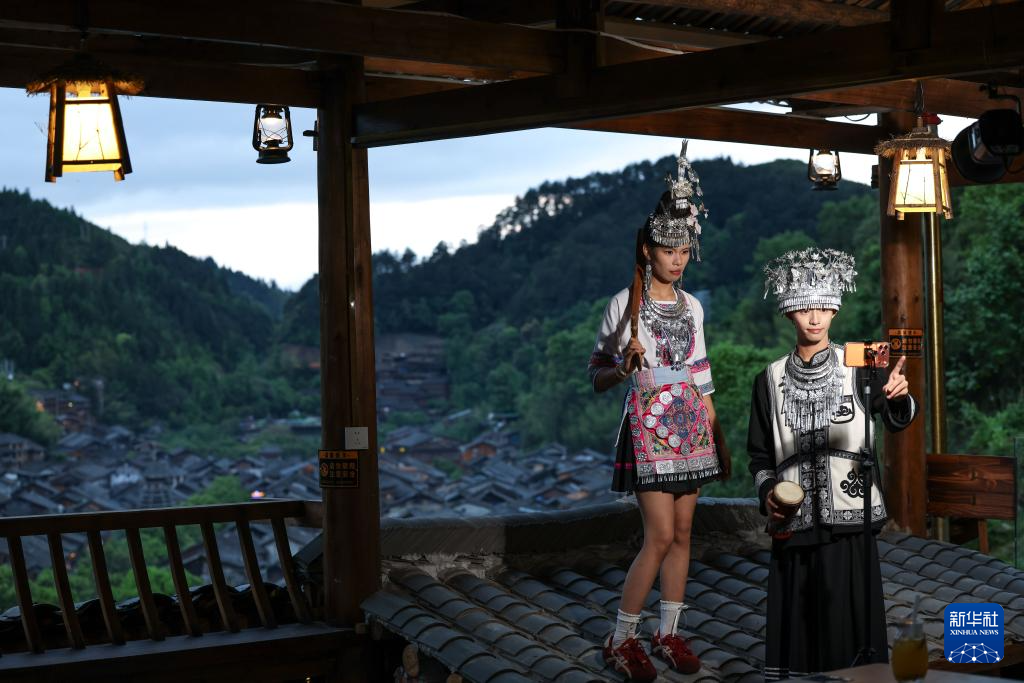 4月20日,游客在肇兴侗寨鼓亭全景咖啡馆打卡拍照。