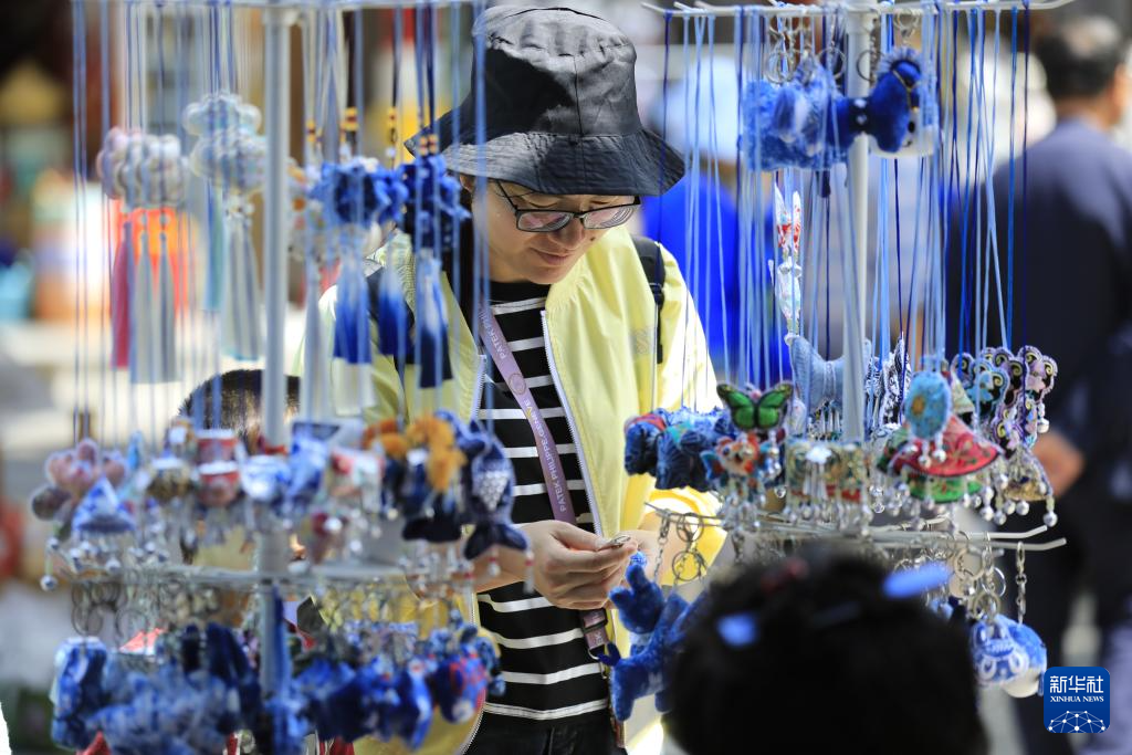 4月18日,游客在肇兴侗寨选购文创工艺品。