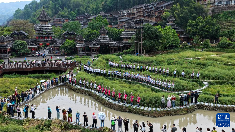 4月20日,在肇兴侗寨的田园间,侗族歌手为游客展示侗族大歌。