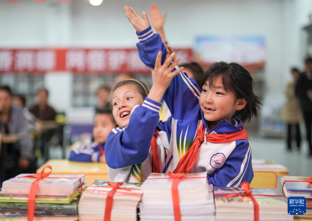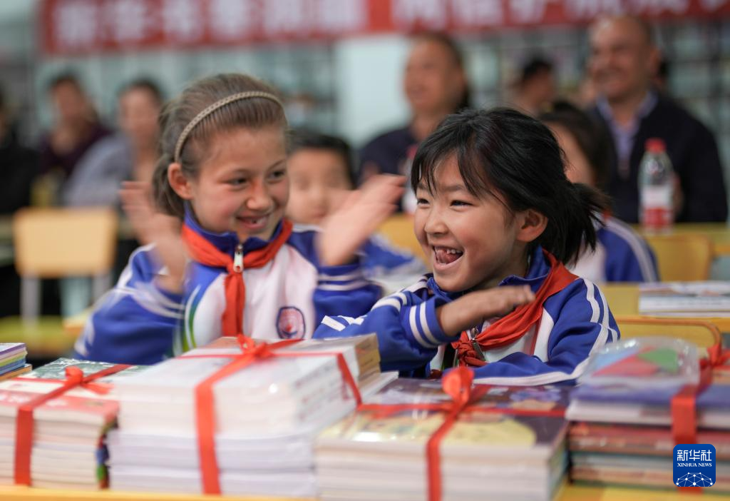 4月21日,在新疆新和县依其艾日克镇依其艾日克村,小朋友高兴地领取到赠送的书籍。
