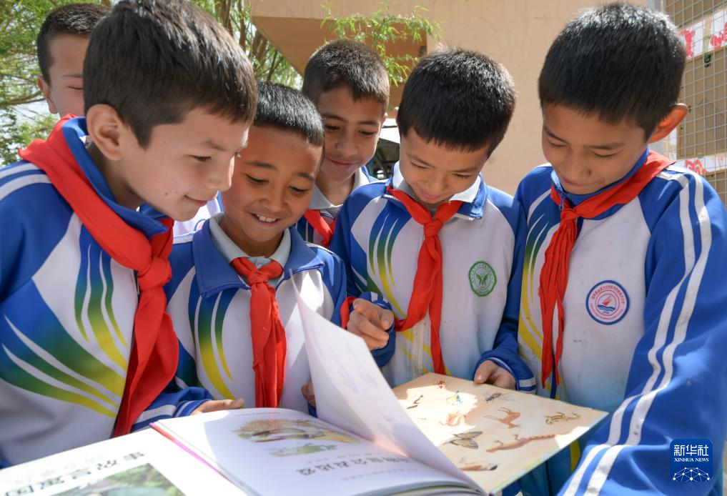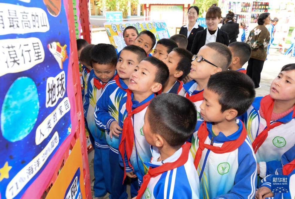 4月21日,在新疆新和县依其艾日克镇木纳尔村小学,小朋友们在“图书巴扎”上阅读书籍海报。