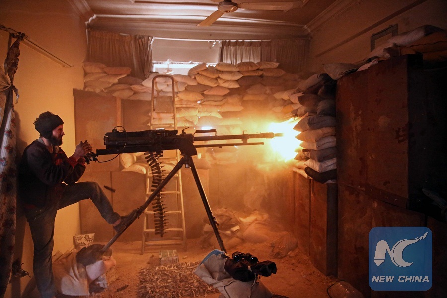 An opposition fighter from the Failaq al-Rahman brigade fires a heavy machine gun in Jobar, a rebel-held district on the eastern outskirts of the Syrian capital Damascus, on March 19, 2017. (Xinhua/AFP Photo)