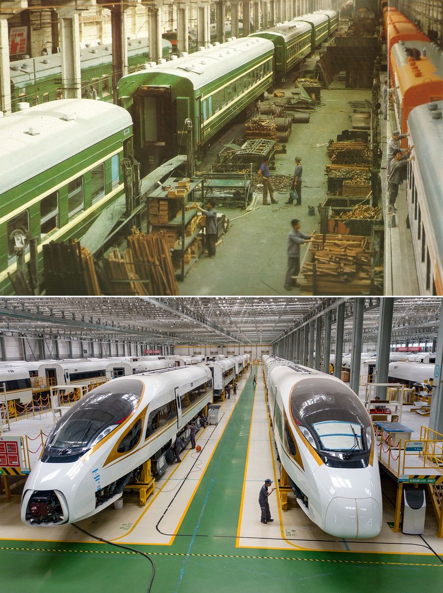 Top: File photo taken in the 1990s shows an assembling line of passenger trains at Changchun railway vehicles manufactory in Changchun, northeast China's Jilin Province.