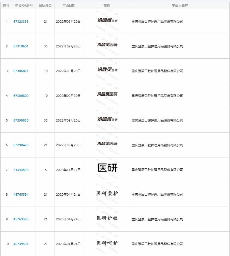 记者查询发现,冷酸灵品牌所属的重庆登康口腔护理用品股份有限公司(简称“登康口腔”)申请注册了多个不同样式含“医研”字样的商标,包括“冷酸灵医研”“医研护敏”“医研”等。