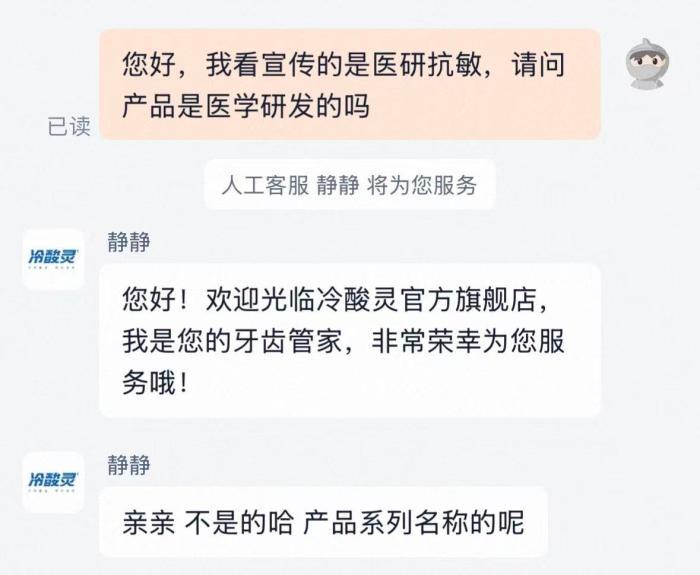 记者以消费者身份询问冷酸灵店铺客服,对方表示,医研不是指医学研发,而是“产品系列名称”。