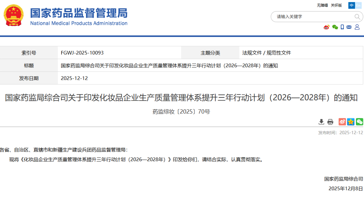國(guó)家藥監(jiān)局綜合司關(guān)于印發(fā)化妝品企業(yè)生產(chǎn)質(zhì)量管理體系提升三年行動(dòng)計(jì)劃(2026—2028年)的通知