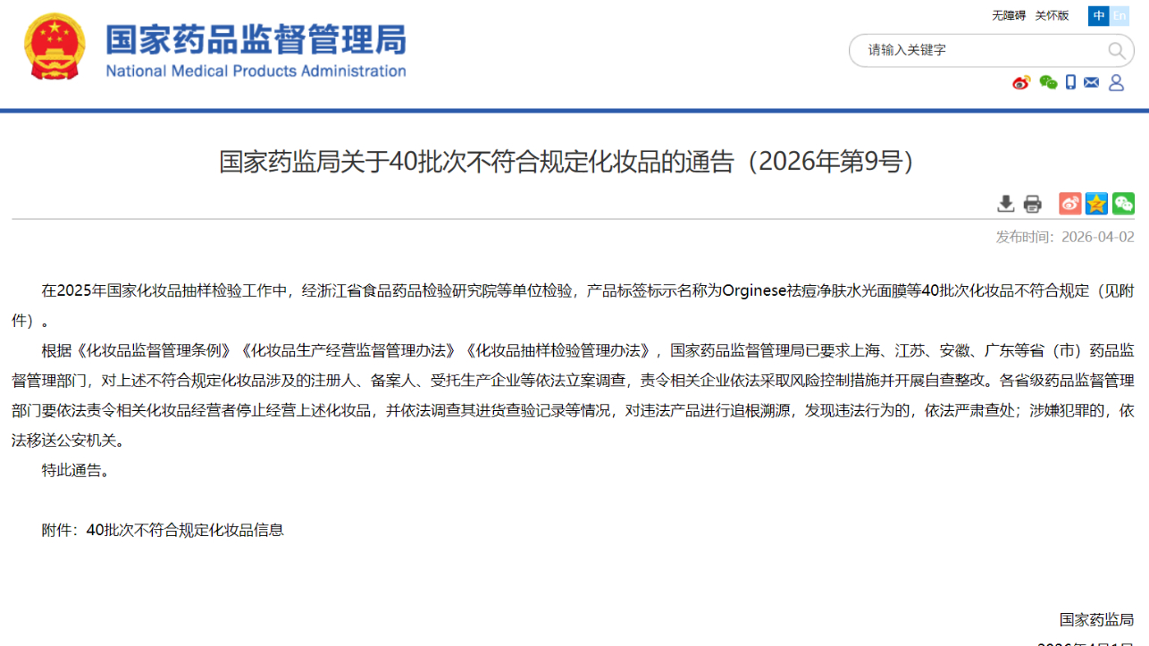 國(guó)家藥監(jiān)局關(guān)于40批次不符合規(guī)定化妝品的通告(2026年第9號(hào))