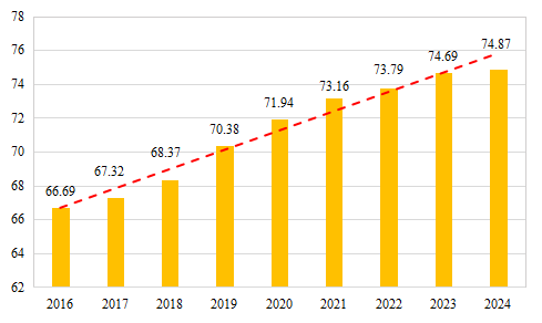 2025年12月13日,课题组利用保险业最新年度披露数据,编制并发布了2024年中国保险机构治理指数(CIIGI),这是自2016年首次编制以来的第九个年度指数。结果显示,2024年中国保险机构治理指数为74.87,较2023年的74.69提升了0.18,表明我国保险机构治理水平稳步提升。2016-2024年中国保险机构治理指数依次为66.69、67.32、68.37、70.38、71.94、73.16、73.79、74.69和74.87,总体呈现逐年上升趋势,2024年指数相较于2016年上升了8.18。从指数平均值变化来看,近几年指数提升的绝对值和百分比较低,治理指数提升幅度趋缓。