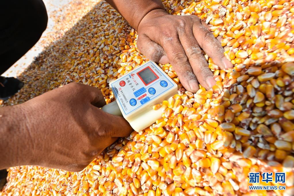 在山西省運城市萬榮縣南張鄉(xiāng)太趙村,種糧戶李挺用儀器測量玉米的含水量(2020年9月20日攝)。據(jù)李挺介紹,農機GPS定位、無人機噴灑農藥、機械化收割等已滲透到農業(yè)生產(chǎn)的各個環(huán)節(jié),臉朝黃土背朝天的農民變成了指揮機器高效種糧的“新農夫”。