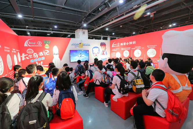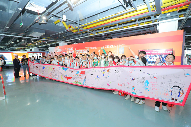 在現(xiàn)場(chǎng),為了慶祝這場(chǎng)期待已久的航天科普展開幕,孩子們用一份“特別的禮物”——一幅繪滿了航天夢(mèng)想與武漢名勝的5米長(zhǎng)卷獻(xiàn)禮中國(guó)航天。在這幅長(zhǎng)卷上,孩子們不僅生動(dòng)地描繪出了武漢的眾多名勝特色,還用天馬行空的想象力展現(xiàn)了自己的航天夢(mèng)。展區(qū)內(nèi),孩子們?cè)谥v解員的帶領(lǐng)下參觀形形色色的“國(guó)之重器”,了解中國(guó)航天發(fā)展史,并且通過(guò)VR等設(shè)備親自體驗(yàn)了一把“太空旅行”。在航天夢(mèng)想體驗(yàn)營(yíng)中,孩子們一起回顧了空間站發(fā)射的精彩瞬間,當(dāng)看到“長(zhǎng)五B”成功升空時(shí),現(xiàn)場(chǎng)爆發(fā)出熱烈的歡呼和掌聲,加油聲此起彼伏,許多孩子還合唱《明天會(huì)更好》對(duì)中國(guó)航天獻(xiàn)上祝福。