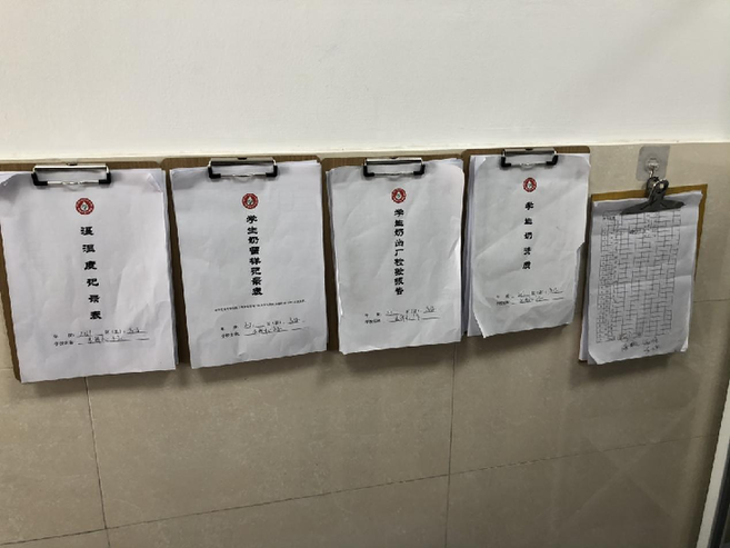 在這些學(xué)校的儲(chǔ)藏室里,學(xué)生奶都按照產(chǎn)品底層墊托板、四周離墻、離地15cm以上等嚴(yán)格要求擺放儲(chǔ)存。學(xué)校的墻上還掛著關(guān)于學(xué)生奶的儲(chǔ)存、領(lǐng)取與分發(fā)、不適反應(yīng)處理流程等規(guī)章制度。