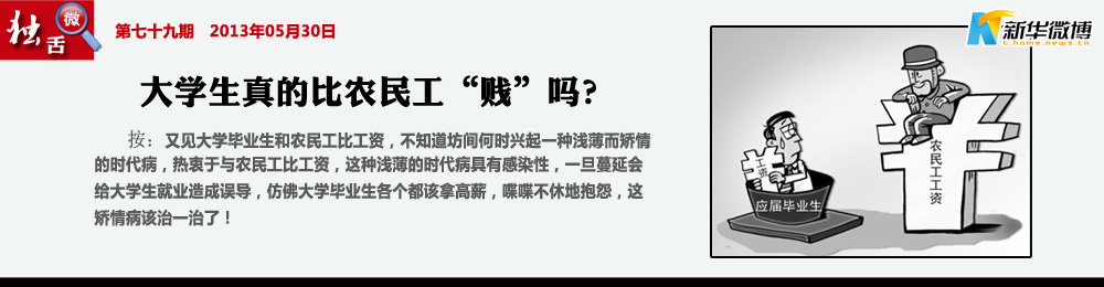 【新名詞:大學生農(nóng)民工】 他們出身農(nóng)村、考上大學進入城市,畢業(yè)后與進城打工的父兄匯流,又重新站在了同一條起跑線上;他們與新生代農(nóng)民工職業(yè)混同,工資相差無幾,生活境遇同樣是在城鄉(xiāng)之間漂浮。對這樣一個近幾年涌現(xiàn)的年輕人群體,我們稱之為“大學生農(nóng)民工”。