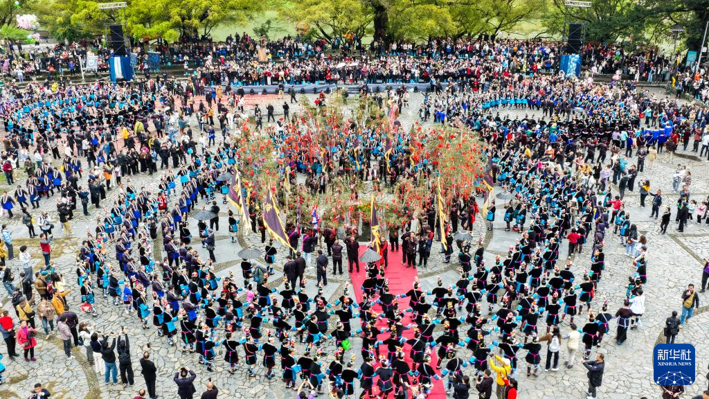 3月28日,侗族群众在贵州省榕江县三宝侗寨“萨玛节”活动中跳多耶舞(无人机照片)。