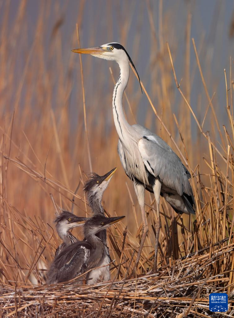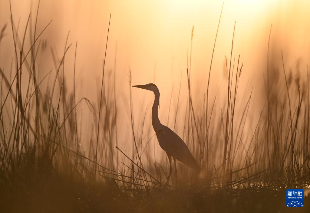 4月18日,苍鹭在沙湖芦苇丛中栖息。