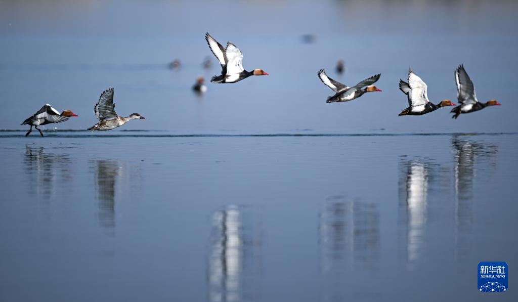 4月18日,赤嘴潜鸭在沙湖水面上飞翔。