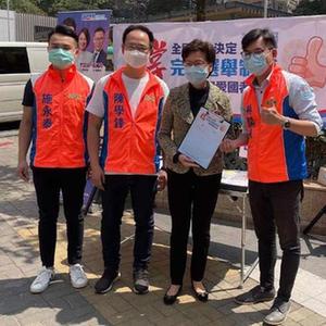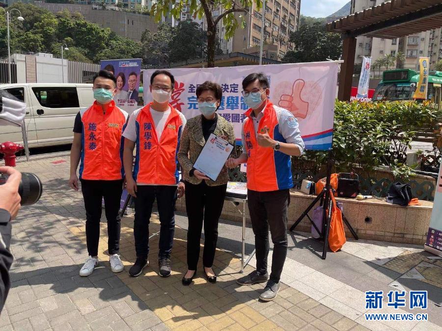 3月15日,香港特區(qū)行政長官林鄭月娥(右二)在位于港鐵堅尼地城站的街站展示簽名。新華社發(fā)