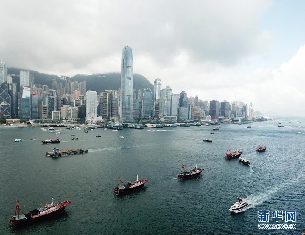 7月1日,插滿旗幟的漁船在香港維多利亞港巡游(無(wú)人機(jī)照片)。新華社記者 李鋼 攝