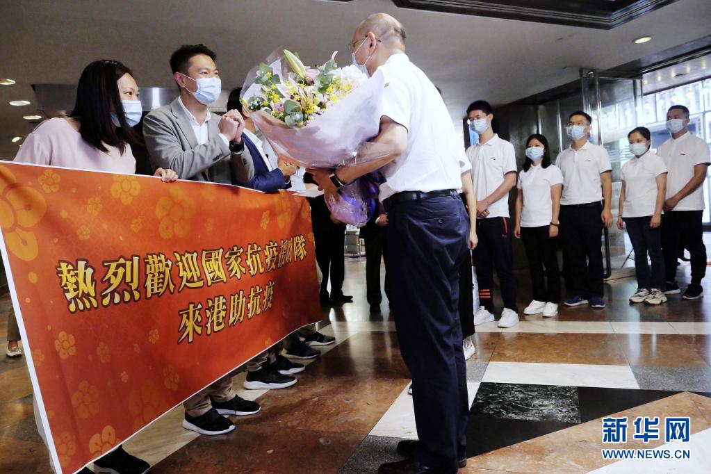 香港市民代表在香港九龍維景酒店歡迎內(nèi)地核酸檢測支援隊(duì)抵港(2020年8月21日攝)。新華社記者 王申 攝