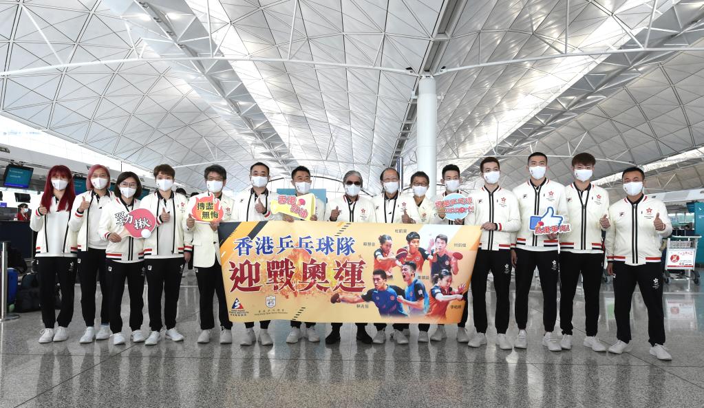 7月17日,中國香港體育協(xié)會(huì)暨奧林匹克委員會(huì)會(huì)長霍震霆(中)、中國香港代表團(tuán)團(tuán)長貝鈞奇(右七)與中國香港乒乓球隊(duì)教練及運(yùn)動(dòng)員合影。當(dāng)日,中國香港代表團(tuán)從香港國際機(jī)場出發(fā)參加?xùn)|京奧運(yùn)會(huì)。據(jù)悉,中國香港代表團(tuán)將有46名運(yùn)動(dòng)員參加?xùn)|京奧運(yùn)會(huì)38個(gè)小項(xiàng)的爭奪。新華社記者盧炳輝攝