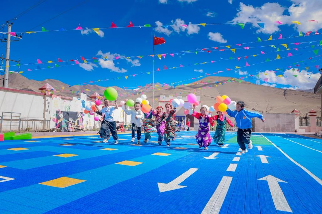 图为孩子们在新建成的乡村儿童操场上游戏。