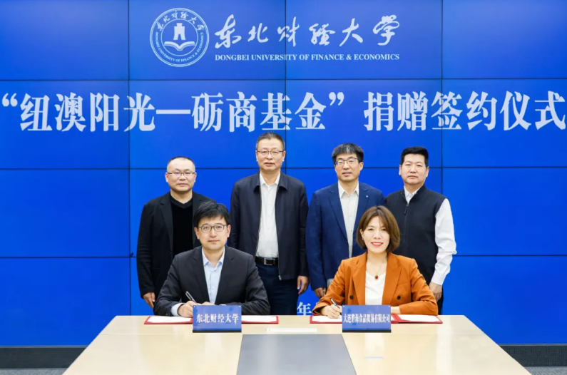 4月22日,东北财经大学“纽澳阳光—砺商基金”捐赠签约仪式在该校笃行楼举行。大连磐海食品贸易有限公司捐资 30万元设立此项基金,用于支持学校工商管理学院人才培养与学生帮扶工作。东北财经大学党委常委、副校长刘险峰,大连磐海食品贸易有限公司董事长张树涛、总经理王丹,大连市山东商会创始人、大连市菏泽商会名誉会长赵殿鹏,学校合作发展与校友工作办公室主任、辽宁省东北财经大学教育基金会秘书长韩非,工商管理学院院长郑文全、党委书记毕克贵等出席仪式。