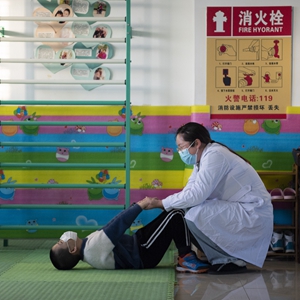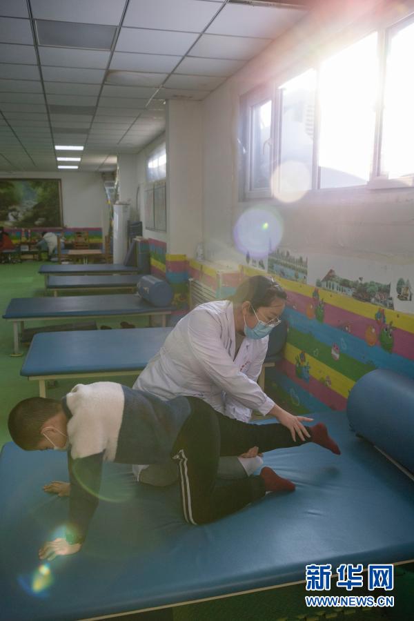 在哈爾濱博能中醫(yī)門診部,劉雨晴為腦癱兒童進行康復訓練(2月2日攝)。