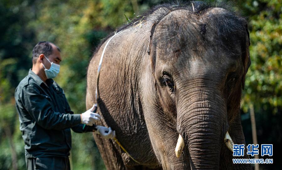 “象爸爸”為一頭名叫“小強(qiáng)”的大象測量腹圍(3月6日攝)。新華社記者 江文耀 攝