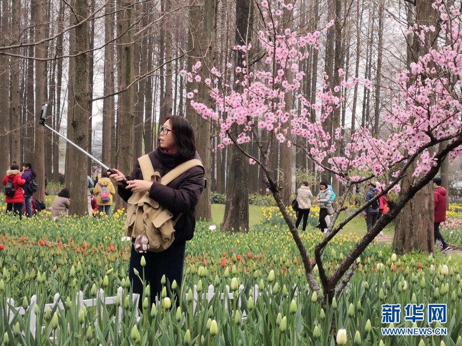 3月8日,一名游客在南京中山植物園內(nèi)賞花自拍。