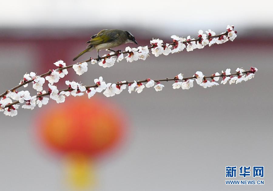 3月8日,小鳥在山東省滕州市公園花枝上覓食。