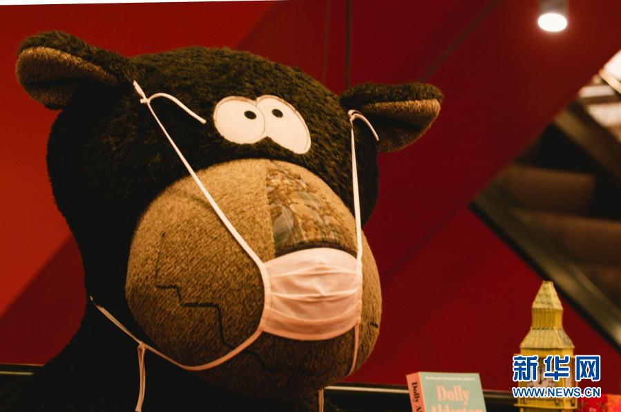 3月8日,德國(guó)科隆一家書店內(nèi)的毛絨玩偶“佩戴”口罩。