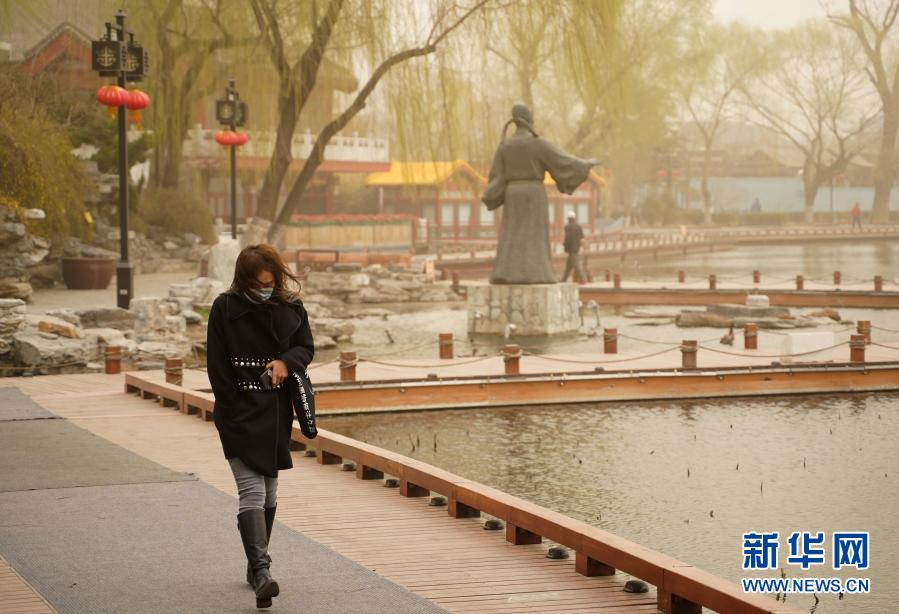 3月15日,市民經過北京西海。當日,我國北方多地出現(xiàn)沙塵天氣。新華社記者 賈浩成 攝
