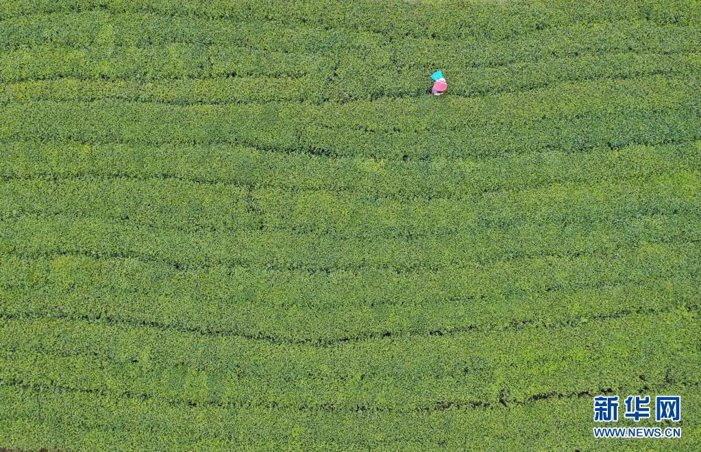 4月2日,茶農(nóng)在福鼎市佳陽(yáng)畬族鄉(xiāng)的一處茶山采茶(無(wú)人機(jī)照片)。新華社記者 林善傳 攝