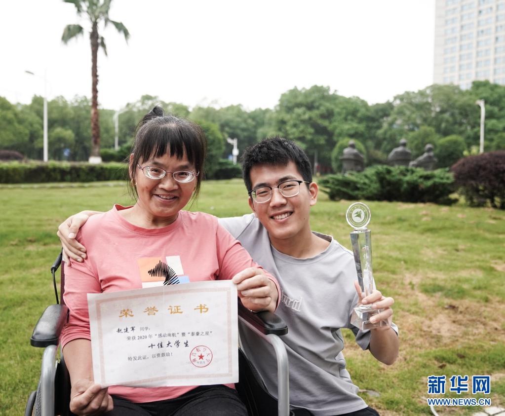 6月2日,趙建軍和母親在校園內(nèi)合影并展示近日獲得的榮譽證書。