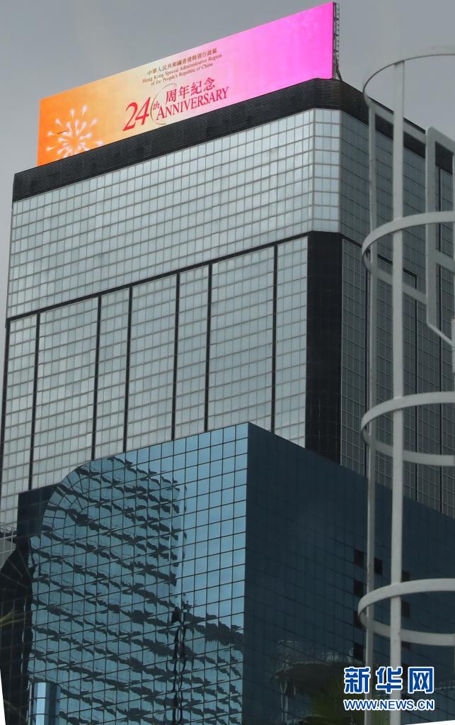 香港街頭建筑物上電子屏顯示的標(biāo)語(yǔ)(6月29日攝)。