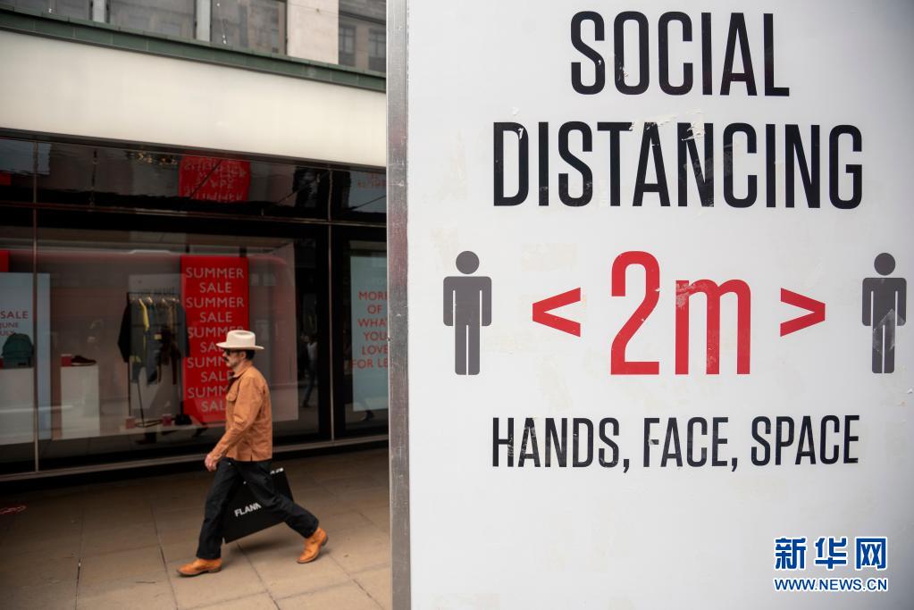 7月12日,在英國倫敦,一名男子從提示人們保持社交距離的牌子旁走過。