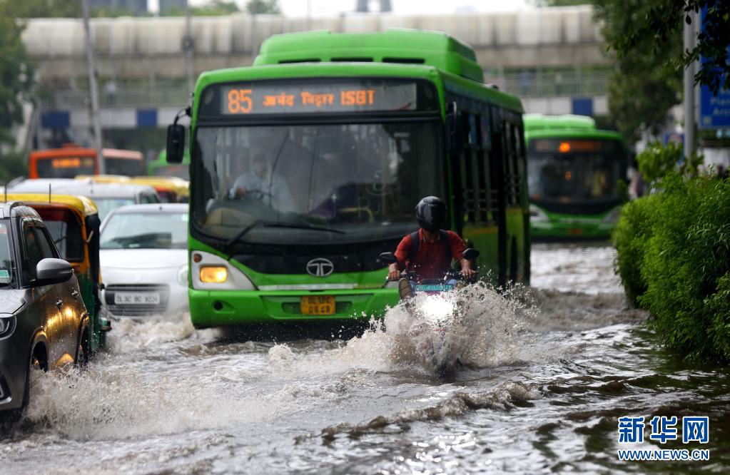 7月14日,車輛在印度新德里積水的街道上行進(jìn)。